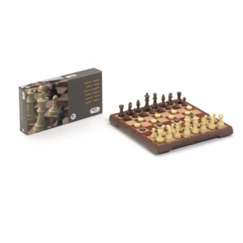 Juego de ajedrez y damas magnético plegable, fabricado en plástico, ideal para viajes. Tamaño de caja: 24x12x5,4 cms. Tamaño desplegado: 24x24 cms.