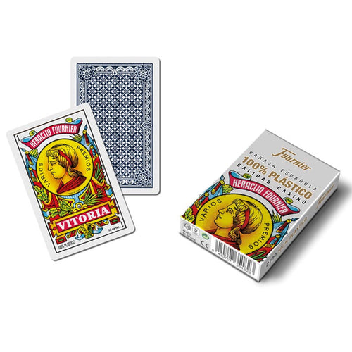 Baraja española de 50 cartas de 100% plástico en estuche de cartón con el dorso azul.