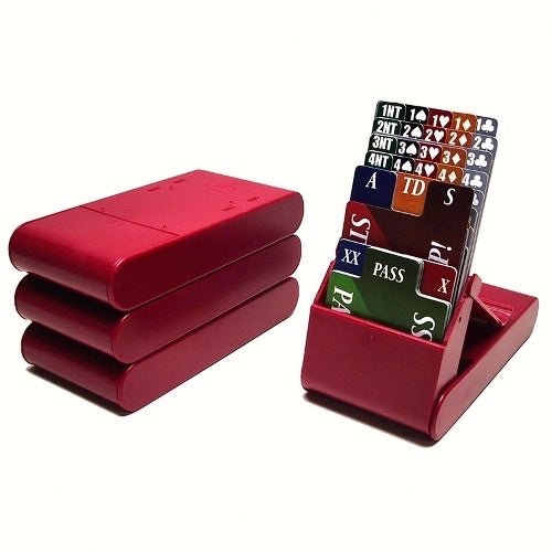 Conjunto de cuatro estuche de bidding boxes rojos en plástico rígido para el juego del Bridge.