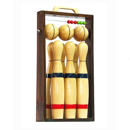 El juego se compone de 6 bolos de 30 cm. de altura y tres bolas de 10 cm.de diámetro fabricadas en madera de haya. Se presenta en un marco de madera con un asa para transportar y guardar cómodamente. Recomendamos su uso en exteriores.