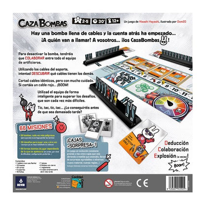 Hay una bomba llena de cables y la cuenta atrás ha empezado. ¿A quién van a llamar? A vosotros… ¡Los Caza Bombas! Sois un equipo de artificieros con los nervios de acero. Turno a turno, trataréis de descubrir qué cables tienen los demás para cortarlos de forma segura. A lo largo de 66 misiones totalmente rejugables, contaréis con las mejores herramientas, que os facilitarán el trabajo, pero cada vez el reto será más difícil… ¡Intentad que no os explote la cabeza!