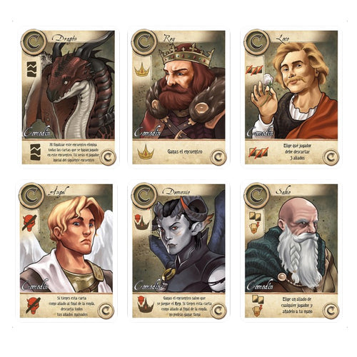 Contenido: Libro de reglas, 36 cartas de personaje, 12 cartas de Crónica, 6 cartasde ayuda y 12 contadores de Fama