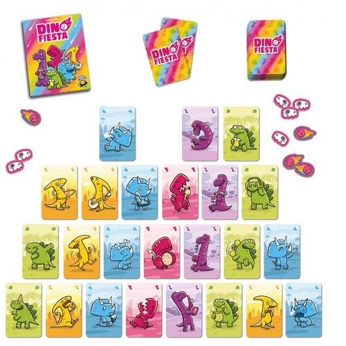 En Dino Fiesta cada carta jugada debe coincidir con el color de una de sus dos cartas inferiores, a menos que la juegues en la base de la pirámide de dinosaurios. Si en tu turno no puedes jugar ninguna de tus cartas, ganas un punto por cada dinosaurio que te quede en la mano. Ganará quien tenga menos puntos al final de la partida.