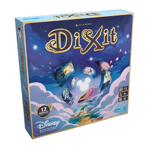 Las mismas reglas de Dixit con nuevo material, de 3 a 6 jugadores, con tablero, diales de votación, fichas de madera... ¡Todo recubierto con la magia de Disney!