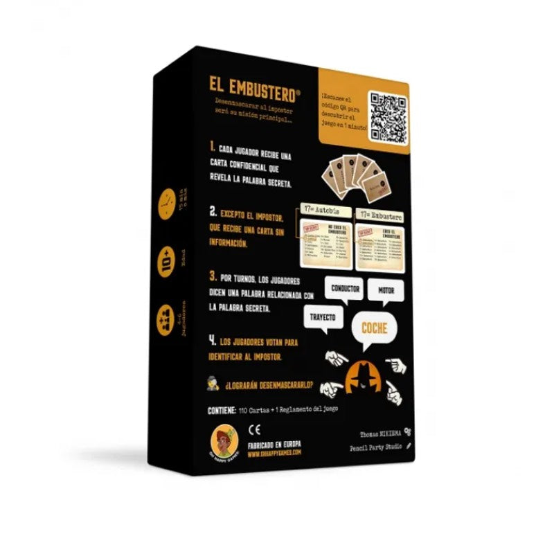 El Embustero es un juego social de palabras con más de 1 millón de jugadores en todo el mundo y miles de partidas en España. En este juego de creatividad y engaño, todo el mundo sabe la palabra secreta excepto uno. Cada turno añade tensión: pistas demasiado obvias ayudan al Embustero; pistas demasiado vagas te ponen en el punto de mira. Ideal para familias, grupos de amigos y fiestas. Partidas rápidas, formato compacto y altísima rejugabilidad. Información del producto: