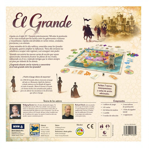 Vuelve El Grande… ¡Por la puerta grande! Esta edición especial, con arte renovado en la caja, el tablero y las cartas, también contiene un libro de reglas revisadas, nuevos componentes y dos miniexpansiones, La nueva regencia y Cambio de poder. Aprovecha esta ocasión única de redescubrir el clásico de mayorías por excelencia, que nos transporta a la España del siglo XV para tratar de dominar el máximo de regiones posibles con nuestros caballeros.