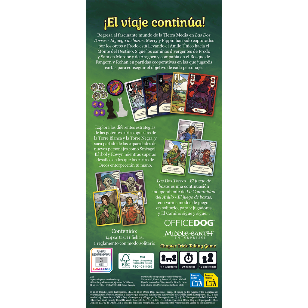 Regresa al fascinante mundo de la Tierra Media en Las Dos Torres - El juego de bazas. Merry y Pippin han sido capturados por los orcos y Frodo está llevando el Anillo Único hacia el Monte del Destino. Sigue los caminos divergentes de Frodo y Sam en Mordor y de Aragorn y compañía en el Bosque de Fangorn y Rohan en partidas cooperativas en las que jugaréis cartas para conseguir el objetivo de cada personaje.