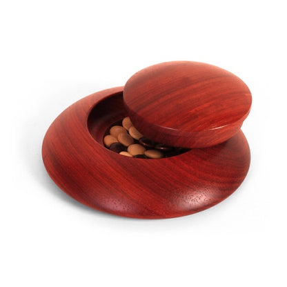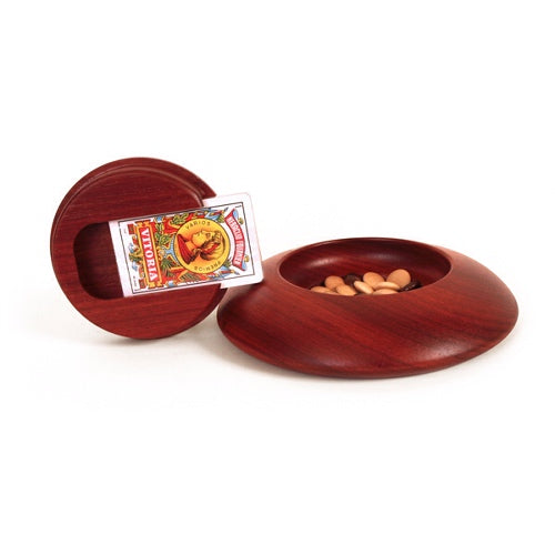 Estuche de mus, con baraja y amarracos. Materiales: palo rojo. Amarracos: madera haya. Tamaño del juego abierto: 20x20x7 cms. Tamaño de caja: 22,5x22,5x7,3 cms. Peso: 1,069 kgs.