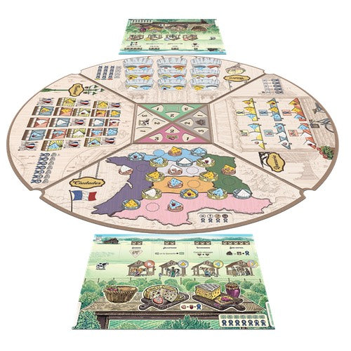 Cuando todos los participantes han terminado sus acciones, el tablero gira, el queso madura y cambia el cuadrante que tiene enfrente cada participante. Al final de la partida, obtienes puntos de prestigio por tu queso y por la gestión de los recursos de tu quesería. Gana quien haya obtenido más puntos de prestigio.