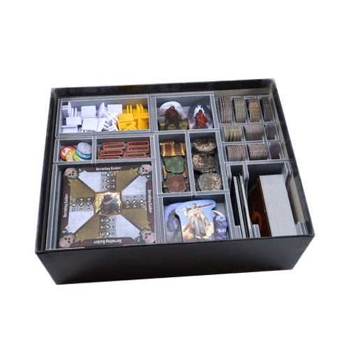 Inserto compatible con Gloomhaven: Jaws of the Lion® / Las Fauces del León. El diseño proporciona tanto un almacenamiento eficiente como una mejora del juego. Muchas de las bandejas pueden utilizarse durante el juego, y facilitan enormemente los tiempos de preparación y retirada. El inserto está dispuesto en tres capas.