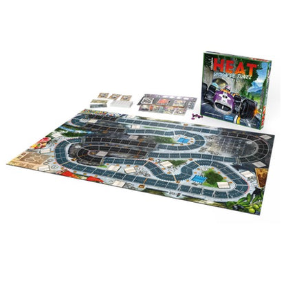 1 enorme tablero de doble cara (2 Circuitos), 2 cartas de Circuito, 1 Coche de carreras con su peón de Caja de cambio correspondiente, 1 tablero de Piloto, 12 cartas de Velocidad, 9 cartas de Motor forzado