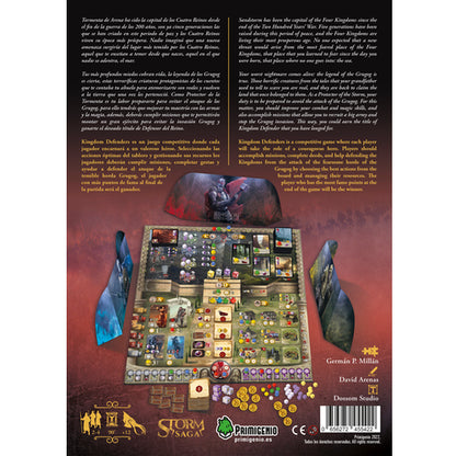 «Kingdom Defenders» es un juego competitivo donde cada jugador encarnará a un valeroso héroe. Seleccionando las acciones óptimas del tablero y gestionando sus recursos los jugadores deberán cumplir misiones, completar gestas y ayudar a defender el ataque de la temible horda Grugog, el jugador con más puntos de fama al final de la partida será el ganador.