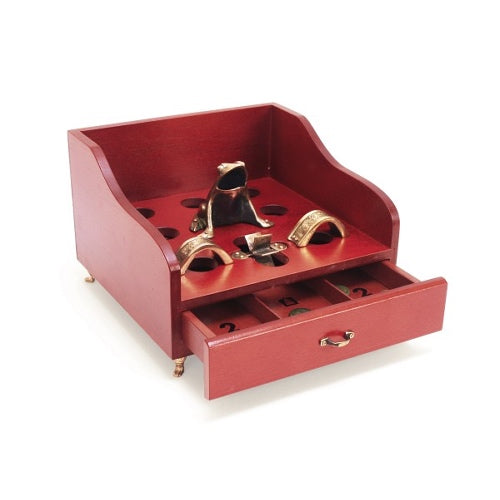 Clásico juego de la rana en versión reducida ideal para interior. El soporte está fabricado en madera de haya, la rana y los demás accesorios en bronce. Los tejos son de madera de boj. Tamaño del juego abierto: 28x28x20 cms. Tamaño del estuche: 30x30x21 cms. Peso: 4,6 kgs .