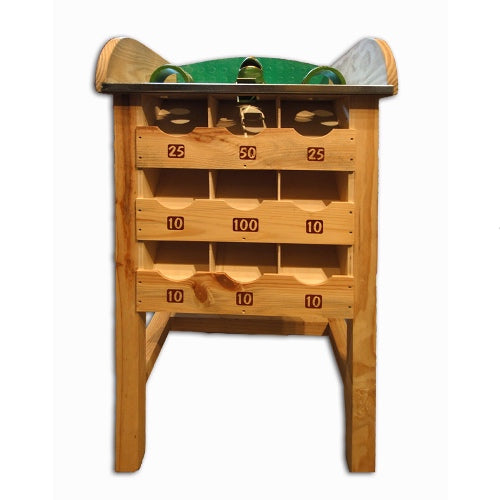 El juego de la rana fue muy popular en el siglo XIX y hasta hace unos diez años estaban situadas al aire libre en numerosos merenderos. Fabricado en madera con la parte superior en metal. Tamaño: 97x52x52 cms. Incluye diez tejos de hierro.