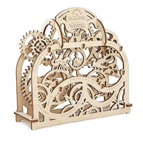 Teatro mecánico realizado en madera contrachapada de alta calidad. Se vende desmontado. Se le da cuerda y giran los engranajes apareciendo diferentes figuras.