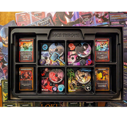 Cada ejemplar de Marvel Dice Throne viene junto a un kit de dos fichas de héroes (Thor y Spider-Man), corregidas para reemplazar a las que vienen dentro de la caja de juego y a entregar al cliente. No es material promocional sino una corrección de la editorial sobre el juego base que Delirium Games ha implementado para esta primera edición.