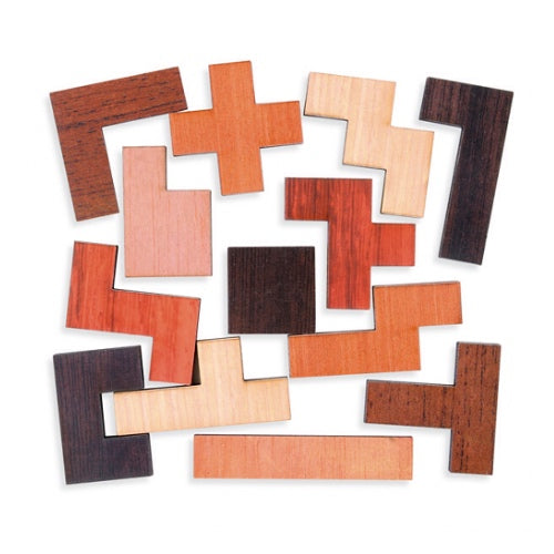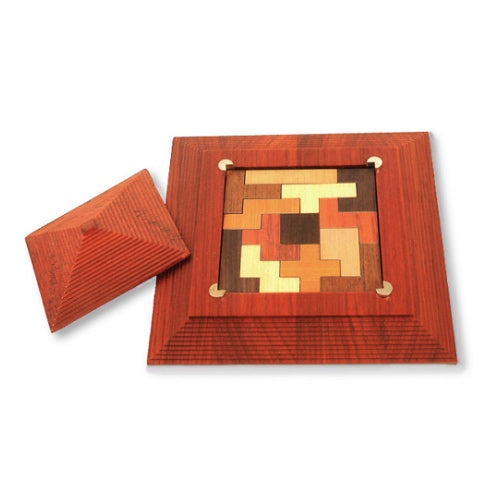 Clásico rompecabezas del pentamino en una versión más elaborada. Las piezas son de taracea y el estuche de palo rojo. Tamaño del juego abierto: 22,5x22,5x4 cms. Tamaño de caja: 23x23x5 cms. Peso: 0,708 kgs.