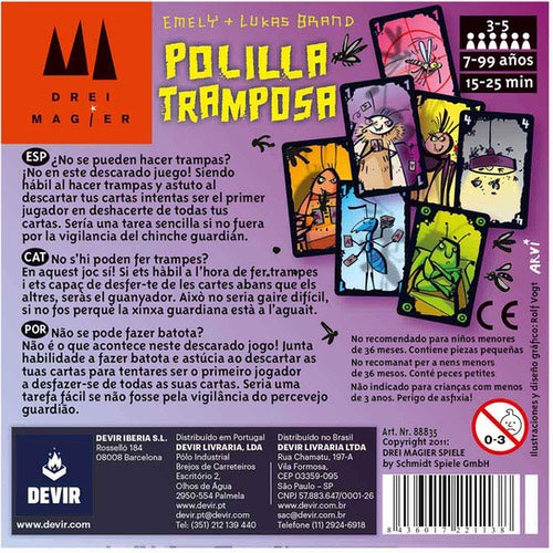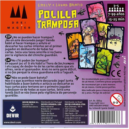 Polilla tramposa es un juego de rapidez y trampas para grupos de 3 a 5 jugadores en el que intentarás deshacerte de todas las cartas de tu mano para ganar. Empieza la partida barajando las cartas y repartiéndolas a todos los jugadores. Colocas el resto de cartas boca abajo en una pila en medio de la mesa, dando la vuelta a una de ellas. ¡Y ya está el set up desplegado sobre la mesa y todo listo para jugar! Polilla tramposa se explica en 5 minutos y se puede llevar a cualquier parte.