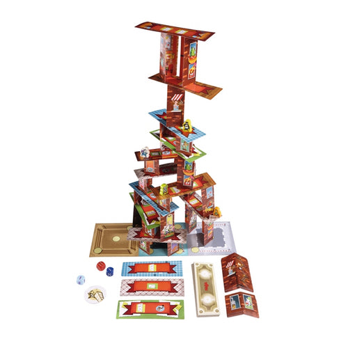 Contenido: 1 tablero (3 cuadrados de doble cara), 30 suelos, 24 paredes bajas, 24 paredes altas, 3 dados (rojo, azul y azul claro), 4 monos-araña, 4 superhéroes (Rhino-Hero, Jirafa Boy, Big E. y Batgüin), 1 medalla de superhéroe, 1 instrucciones del juego.