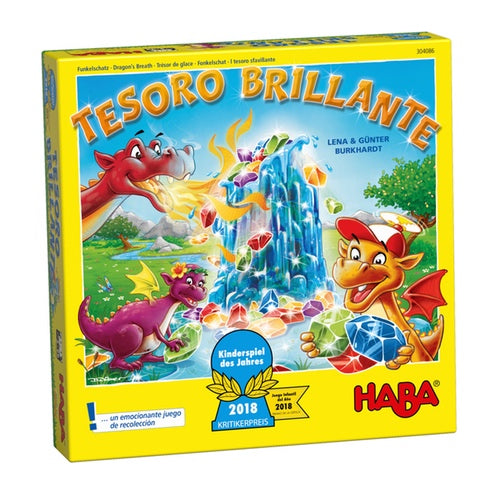 Gracias a la bocanada de fuego de papá, la columna comienza a derretirse y poco a poco van rodando las piedras brillantes hacia abajo. Rápidamente, los chicos-dragón recogen el preciado tesoro y lo llevan a sus cuevas. Con un poco de suerte, ¡incluso papá-dragón puede llevarse un par de piedras!