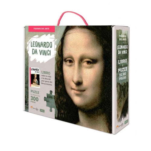 Un práctico y elegante estuche con un fantástico libro sobre la vida y obra de Leonardo da Vinci y un rompecabezas de 300 piezas sobre la Mona Lisa.
