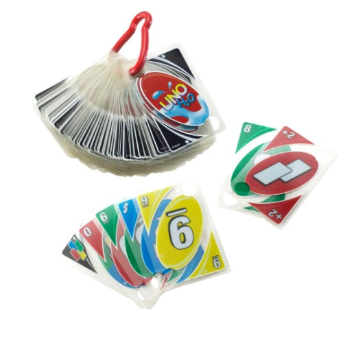 Estas cartas de plástico son resistentes al agua, así que puedes disfrutar de diversión para toda la familia en todas partes, incluso de acampada. Para guardar juntas todas las cartas, UNO H2O To Go también viene con un práctico clip que se puede sujetar de la bolsa de la playa, una mochila o cualquier accesorio de acampada. ¡Podrás echar una partida de UNO en cualquier parte y cuando quieras! ¡Disfruta del clásico UNO o varía el juego jugando a dos manos, en equipo u organizando torneos! Contiene 108 cartas UNO H2O To Go. A partir de 7 años.